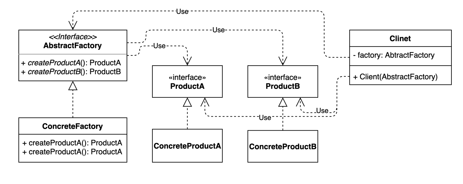 즉, 추상 팩토리 패턴은 팩토리 메소드를 한번 더 추상 팩토리로 묶고 어떤 클래스를 구현할 것인지 클라이언트 코드에서 주입해 구체적인 클래스의 의존성을 최대한 제거한 구조