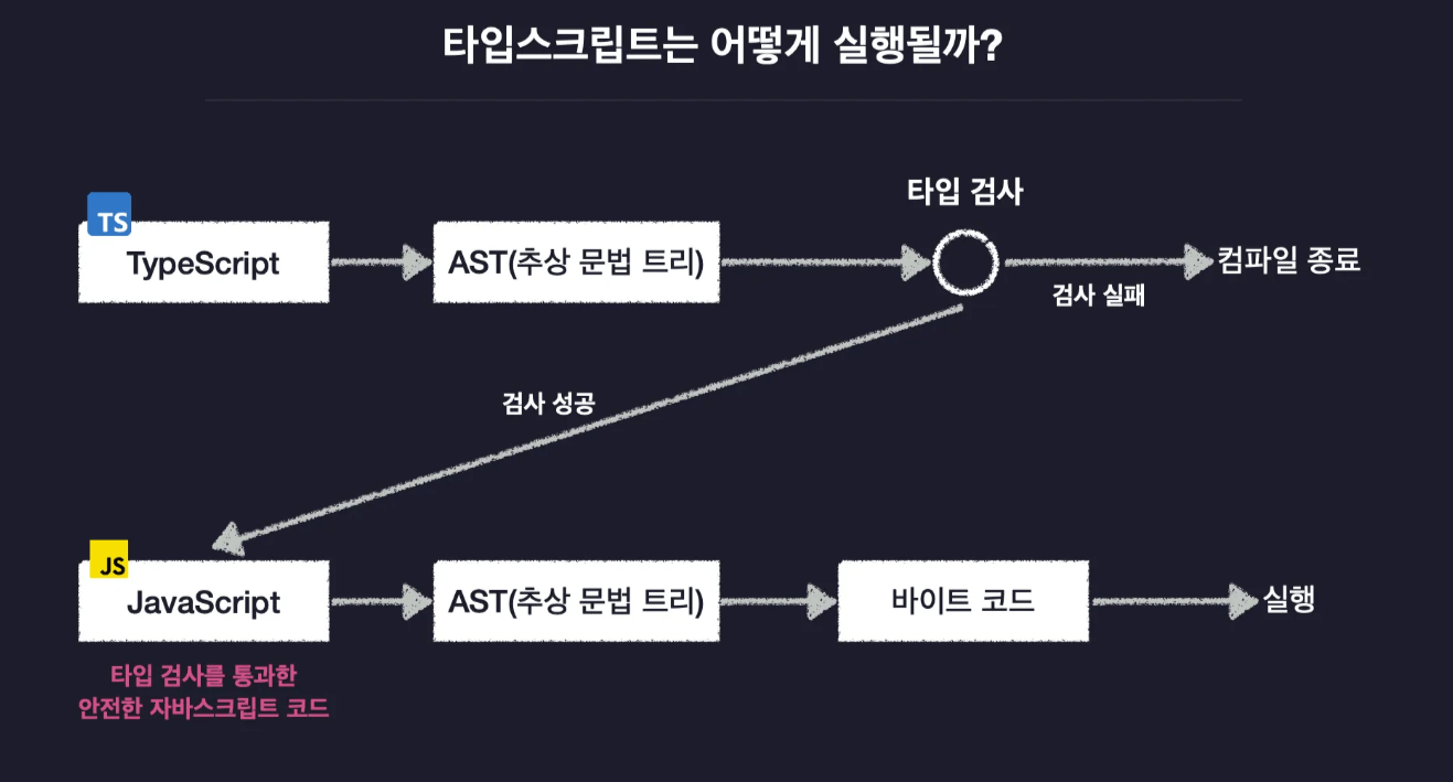 - 타입스크립트의 컴파일은 우리가 작성한 코드에 타입 오류가 없는지 검사하고 오류가 없다면 자바스크립트 코드로 변환한다.
