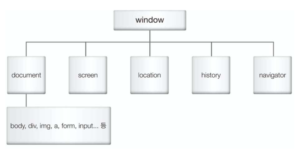 하위 객체로는 document, screen, location, history, navigator 5개의 객체가 있다.