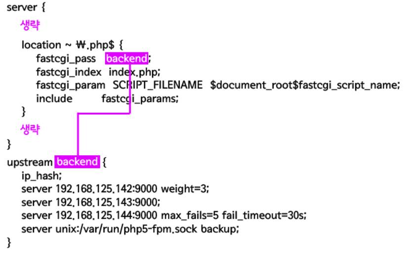fail_timeout=n : max_fails가 지정된 상태에서 이 값이 설정만큼 서버가 응답하지 않으면 죽은 것으로 간주한다.