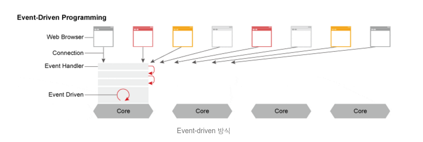 Event-driven 방식은 Event Handler를 통해 비동기 방식으로 처리해 먼저 처리되는 것부터 로직이 진행된다.