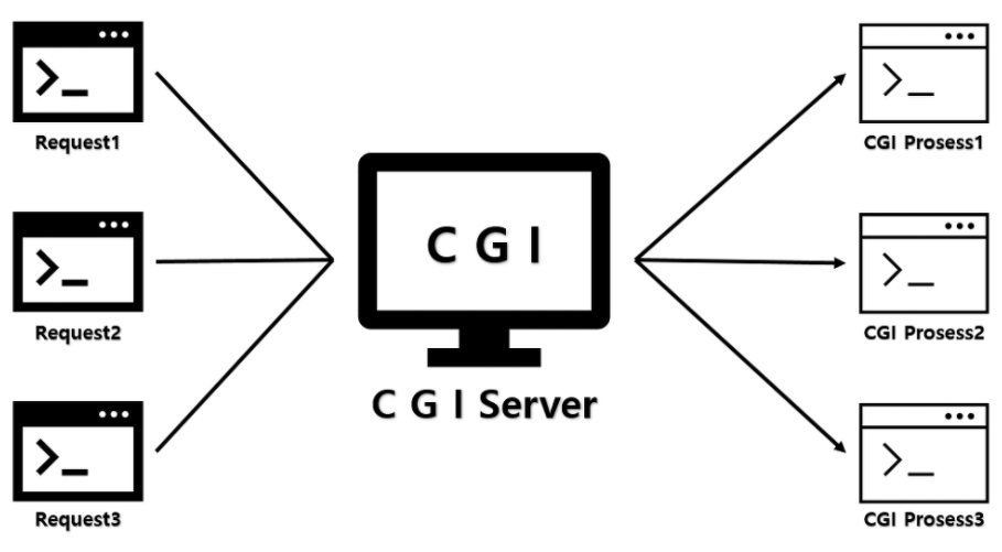 하나의 큰 프로세스로 동작한다. 이 프로세스가 계속해서 새로운 요청(Request) 처리(CGI 단점 해결)